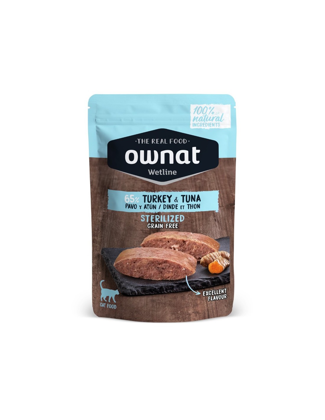 Compositions : Dinde (50%), bouillon (31,9%), thon (15%), patate douce (2%), substances minérales, curcuma (0,1%).